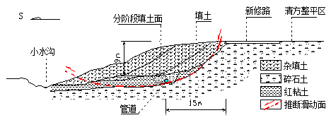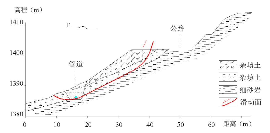 滑坡为道路外侧填方边坡沿基岩面发生滑动形成(图2、3)。滑坡后缘宽度约30m,前缘宽约40m,滑坡后缘到管道距离约25m,厚度约4~8m,滑坡体积约6500m3。