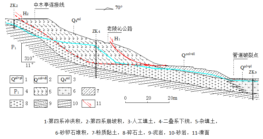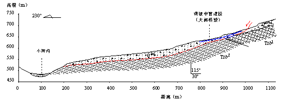 西*线与煤层气管道近东西向纵坡敷设,斜坡长度约170m,坡度18-37°。地层上部为覆盖层,厚度13-25m,包括上部的人工填土和下部的坡积物,基岩为二叠系下统砂岩、页岩,基岩产状平缓(310°∠11°)。