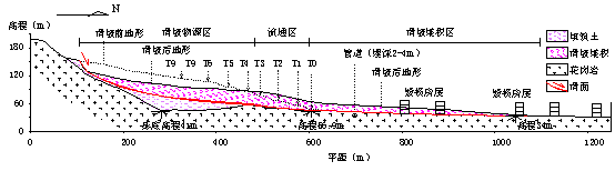 事故发生前红坳受纳场渣土堆填体由北*南、由低*高呈台阶状布置,共有9*台阶(图7)。0*台阶高程56.9m,堆填体实际.高高程 160.0m。西气东输二线管道广深支干线管道位于红坳受纳场以北,距离约70-200m,埋深2m-4m,管径914mm,设计压力10MPa。管道高程与滑坡前缘高差约60m,管道走向与滑动方向基本垂直。